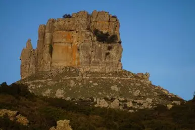 Perda 'e Liana, in the upper part is constituted by a majestic cylindrical tower, calcareous-dolomitic (Jurassic, marine sedimentation of 130-150 million years ago), of a diameter of a hundred meters. Its sub-vertical walls, 50 meters high, enclose a sub planar surface of +/-100 meters in diameter. Below there is a structure of collapse and erosion, the characteristic truncate-conical shape, composed of limestone-sandstone sometimes to quartz pebbles (ingress river deltizia), degrading to the compact base of Palaeozoic schist formed in the Permian for levelling the ercinica chain. The name liana could derive from the characteristics of the rock polished or from olione, the strawberry that covered the slopes, or the Ilienses, a Nuragic people who gathered at the base of the limestone peak. Be careful, you will climb quite easily to the middle of the rocky tower, overcoming only a third-degree passage. Climbing to the top is only for climbers or hikers accompanied by expert guides.